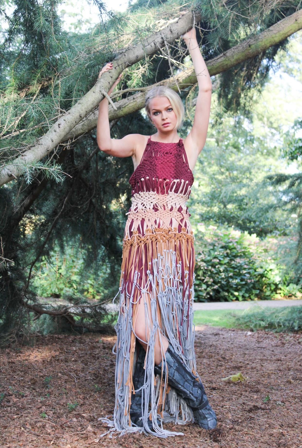 The dress is designed with four different types of intricate macrame knots, demonstrating exceptional craftsmanship and artistry. Each knot contributes to the overall texture and visual appeal, making it a standout choice for special occasions or casual outings alike. Embrace the perfect combination of comfort and style with this eye-catching dress that is sure to turn heads wherever you go!
