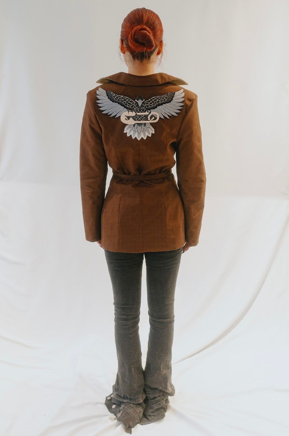 Expertly crafted, this luxury garment features intricate embroidery, employing the Irish machine embroidery technique to portray an eagle grasping a safety pin—a powerful symbol of strength and evolution in fashion. Constructed from exclusive deadstock fabrics, this fully reversible blazer allows effortless transitions from day to night—sport it with the green side out for a touch of understated elegance or switch to the brown side for a striking statement.